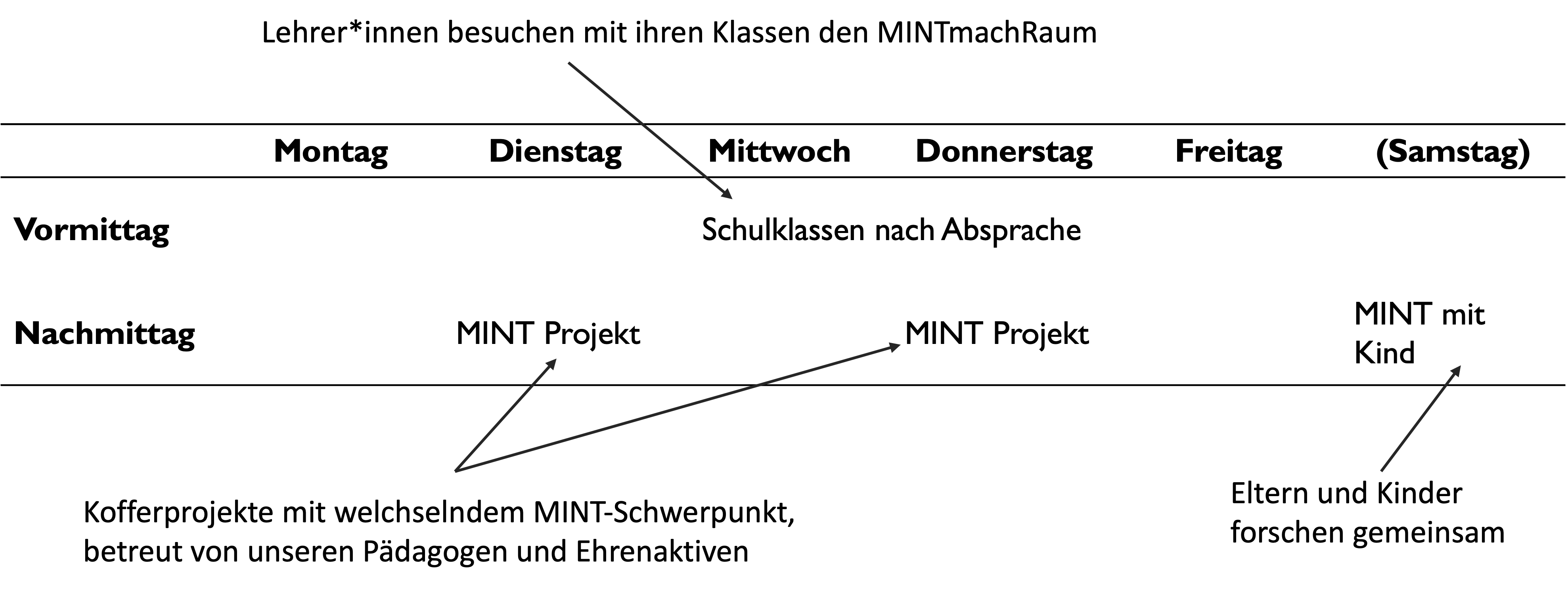 MINT kann vieles bedeuten – und auch in einem MINT-Mach-Raum kann man vieles gestalten. Eine typische Woche in unserem MINTmachRaum kann so aussehen. Nach Absprache können uns Schulklassen vormittags besuchen, um selbständig oder angeleitet MINT-Projekte zu bearbeiten. Nachmittags wird ein MINT-Programm mit wechselndem Schwerpunkt (M, I, N, T) angeboten, der sich auch nach Interessen und Alter unserer Besucher:innen richtet.