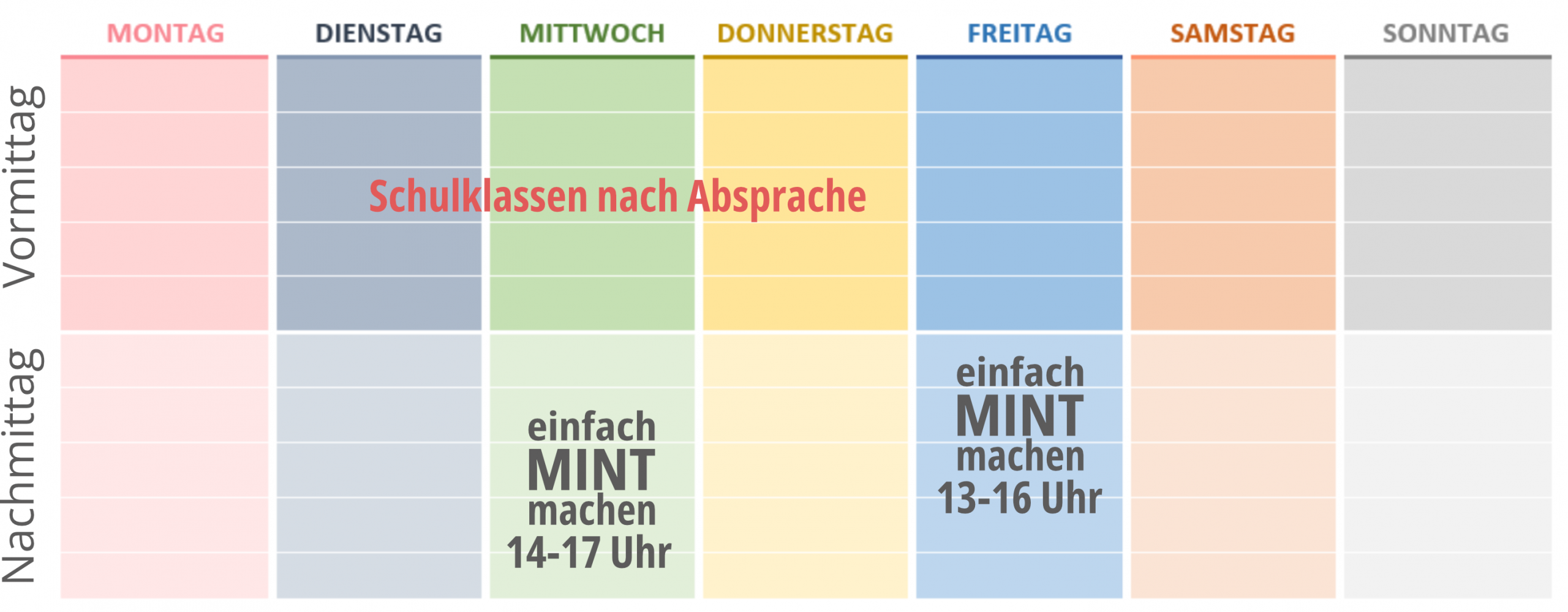 Eine typische Woche in unserem MINTmachRaum kann so aussehen: Nach Absprache können uns Schulklassen vormittags besuchen, um selbständig oder angeleitet MINT-Projekte zu bearbeiten. Nachmittags wird ein MINT-Programm mit wechselndem Schwerpunkt in Mathematik, Informatik, Naturwissenschaften oder Technik angeboten, der sich auch nach Interessen und Alter unserer Besucher:innen richtet.