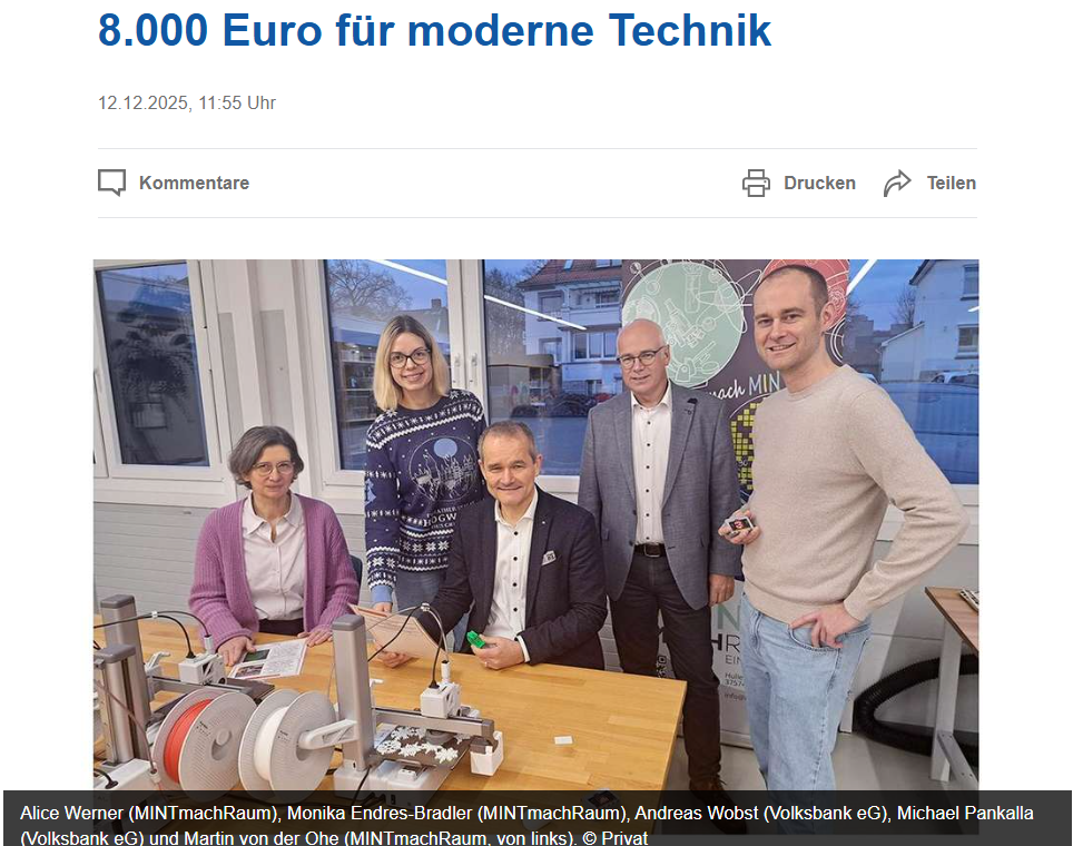 Einbeck – Große Freude im MINTmachRaum: Dank einer großzügigen Zuwendung der Volksbank eG in Einbeck in Höhe von 8.000 Euro aus den Reinerträgen des VR-Gewinnsparens konnte der Raum für MINT-Bildung (Mathematik, Informatik, Naturwissenschaften und Technik) mit moderner Technik ausgestattet werden. Die Förderung ermöglichte die Anschaffung eines MakerLab-Kits, das unter anderem 3D-Drucker, einen Lasercutter und Elektronik-Entwicklungsboards umfasst. Ergänzt wird die Ausstattung durch eine senseBox, die es den Nutzerinnen und Nutzern erlaubt, Umwelt- und Klimadaten zu messen und auszuwerten.