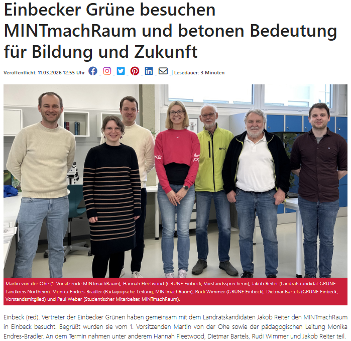 Einbeck (red). Vertreter der Einbecker Grünen haben gemeinsam mit dem Landratskandidaten Jakob Reiter den MINTmachRaum in Einbeck besucht. Begrüßt wurden sie vom 1. Vorsitzenden Martin von der Ohe sowie der pädagogischen Leitung Monika Endres-Bradler. An dem Termin nahmen unter anderem Hannah Fleetwood, Dietmar Bartels, Rudi Wimmer und Jakob Reiter teil.
