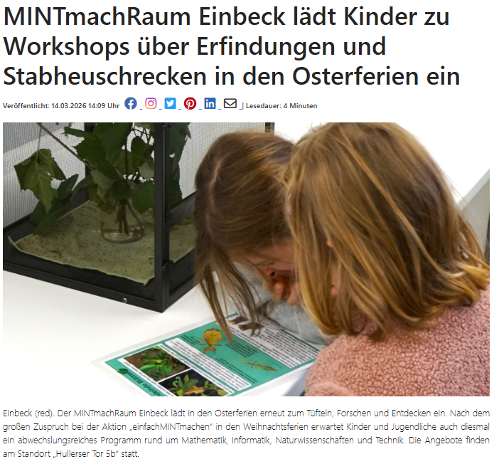 Einbeck (red). Der MINTmachRaum Einbeck lädt in den Osterferien erneut zum Tüfteln, Forschen und Entdecken ein. Nach dem großen Zuspruch bei der Aktion „einfachMINTmachen“ in den Weihnachtsferien erwartet Kinder und Jugendliche auch diesmal ein abwechslungsreiches Programm rund um Mathematik, Informatik, Naturwissenschaften und Technik. Die Angebote finden am Standort „Hullerser Tor 5b“ statt.