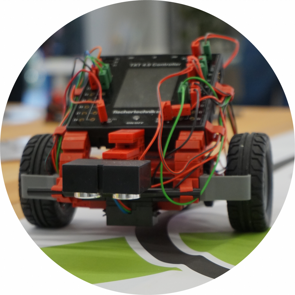 Am Ende des Kurses hat jedes Team einen Fischertechnik-Roboter selbst gebaut und verfügt über grundlegende Kenntnisse im Programmieren mit ROBO Pro Coding.